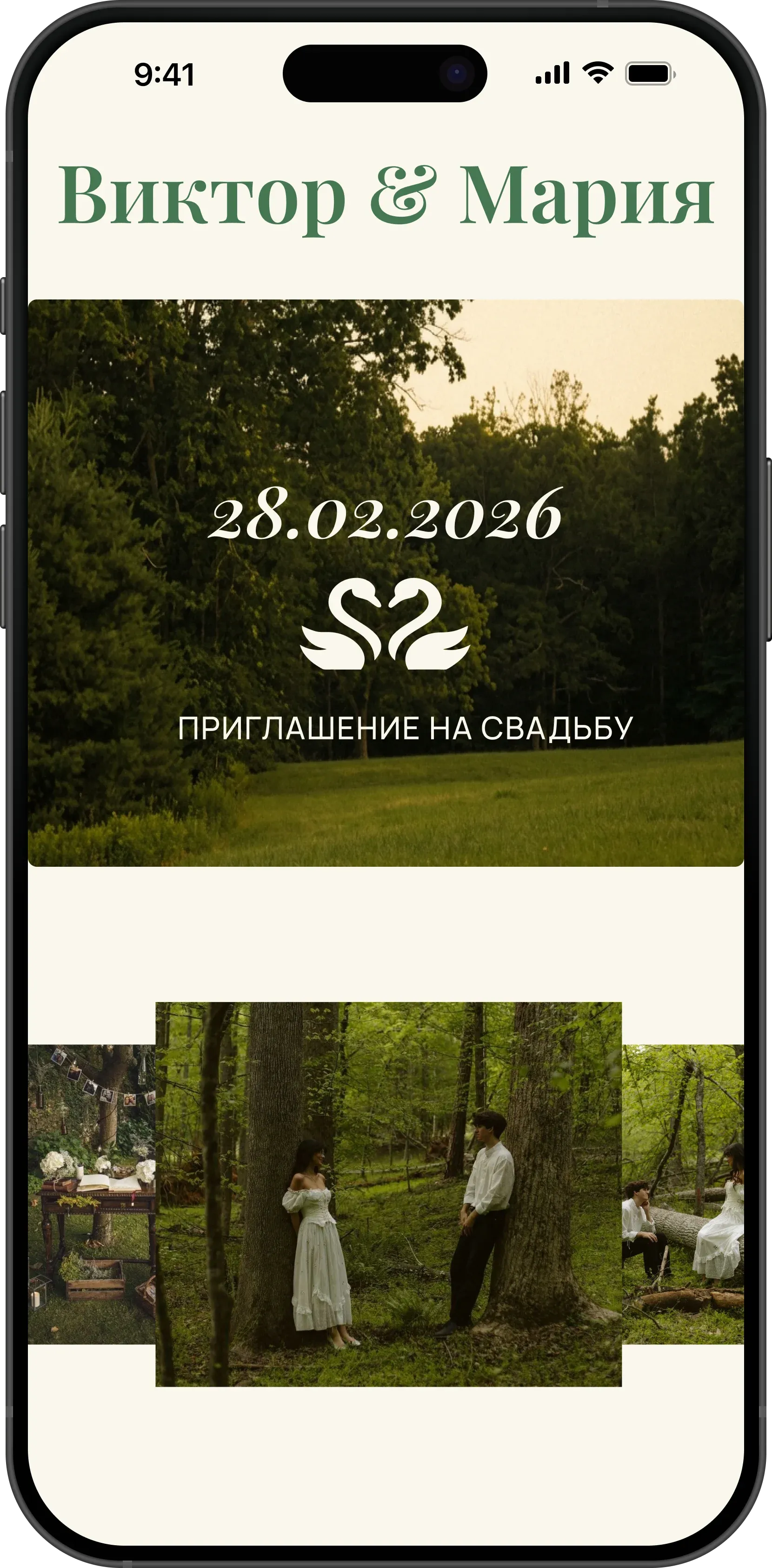 Каждое приглашение — это уникальная веб-страница с вашей историей, фотографиями и всей необходимой информацией для гостей